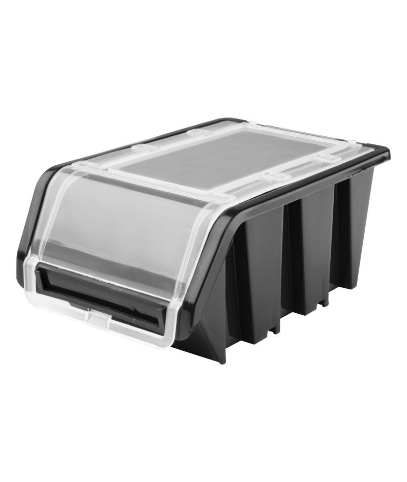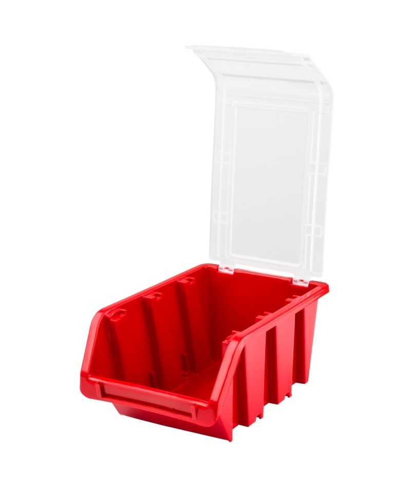 Een speciale deksel beschermt objecten tegen stof, stelt u in staat om de stapelbak te verplaatsen zonder het risico van morsen van de inhoud.